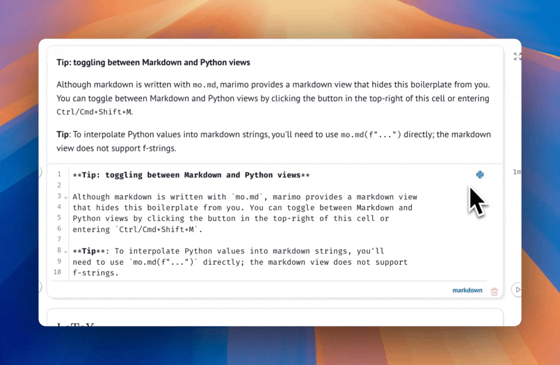 marimo automatically renders cells that only use mo.md(""), without an f-string, in a markdown editor that supports common hotkeys.