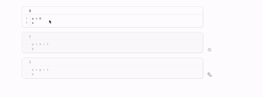 Traditional notebooks like Jupyter have hidden state: running a cell may change the values of global variables, but these changes are not propagated to the cells that use them. Worse, deleting a cell removes global variables from visible code but not from program memory, a common source of bugs. The problem of hidden state has been discussed by many others [1] [2].